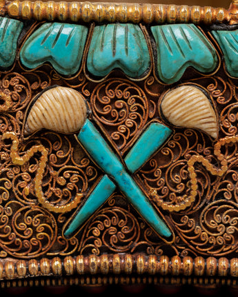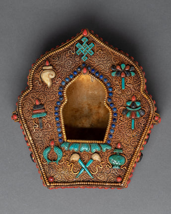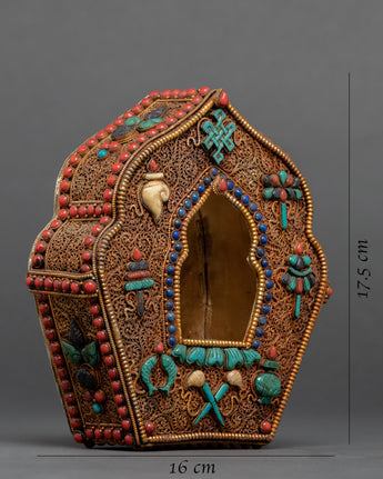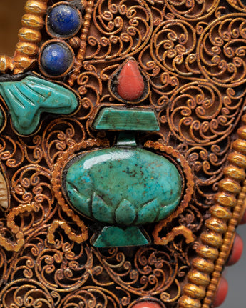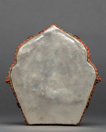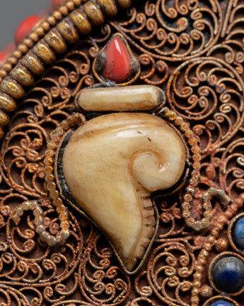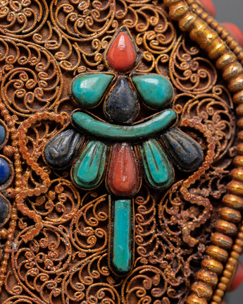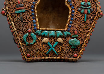 Our Tibetan Ghau Box has a copper body that is embellished with precious and semi-precious stones to give it a distinctive appearance. This treasure box feature wonderfully handcrafted Tibetan emblems and embellishments, such as lotus flowers, Tibetan snow lions, clouds, and conch shells. This lovely box may be used to store jewellery and other small accessories or as room decor.