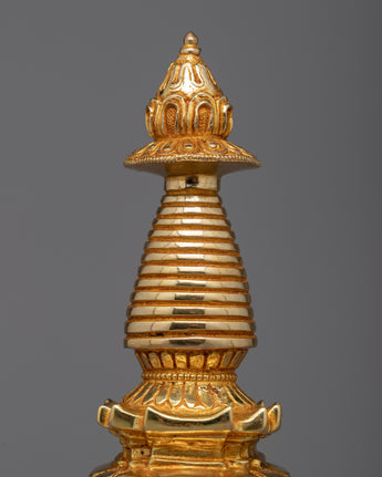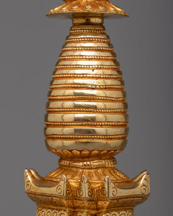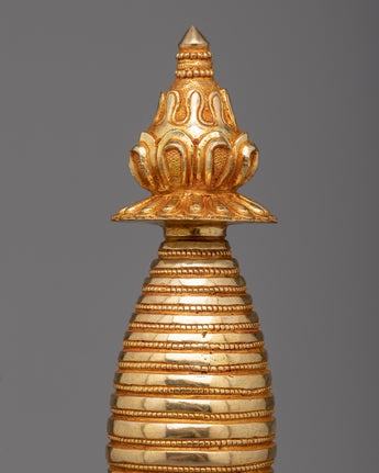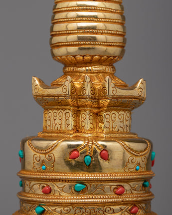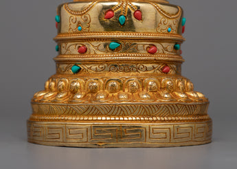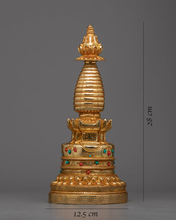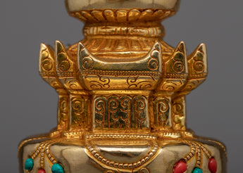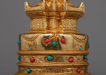 Step into the realm of divine tranquility with our mesmerizing Tibetan Kadampa Stupa, a masterpiece handcrafted on a lustrous Copper body. Gleaming with splendor, the stupa is adorned with resplendent 24k Gold Plating that radiates a heavenly glow. Exquisite gemstones are thoughtfully embedded, enhancing its sacred aura. This stupa is not just a symbol of enlightenment but a manifestation of art and devotion. Embrace its profound energy and let it guide you on a spiritual journey like no other. Elevate your sacred space with the timeless allure of the Tibetan Kadampa Stupa.