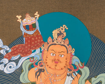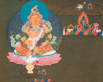 Together, these three deities symbolize the comprehensive protection and accumulation of wealth, from material to spiritual prosperity. Namtoshe guards against loss and harm, Dzambhala actively attracts wealth, and Vasundhara nurtures growth and sustenance. Owning this Thangka signifies welcoming prosperity, protection, and spiritual development into one's life. It serves as a powerful talisman for personal devotion or an inspiring addition to a collection, symbolizing abundance and resilience.
