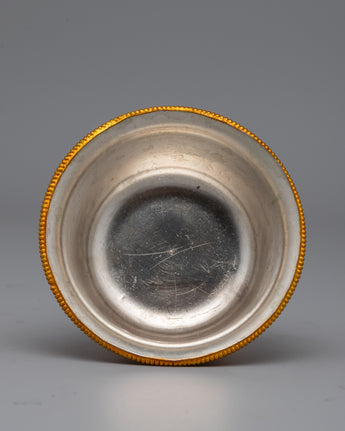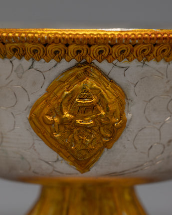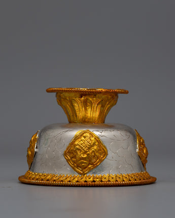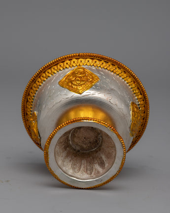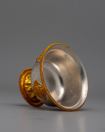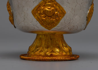 The seven bowls in the Tibetan Offering Bowl Set are expertly fashioned by hand, with a sturdy copper body and opulent electrogold and silver plating. With a combined weight of 1.11 kg, this set is heavy and exquisite to look at, the gold and silver tones highlighting the fine workmanship and age-old craftsmanship. These bowls serve as both attractive accents and necessary tools for Tibetan Buddhist rituals. Offerings like grains, water, or flowers are placed inside of them to represent generosity and the accrual of merit.