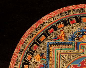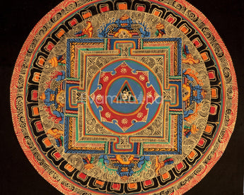 At the center of the mandala, "Om" is surrounded by a protective triangle, radiating powerful spiritual energy. It is surrounded by intricate rings of flames, lotus petals, and vajra gates, each symbolizing distinct stages of purification, initiation, and spiritual revelation. The perfect symmetry and sacred proportions reflect the harmony of the universe, drawing the mind inward to its source. Unlike deity-focused thangkas, this composition centers on the audible and symbolic significance of creation, making it suitable for those seeking inner stillness, clarity, and a connection to the universal vibration of Om.