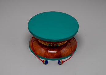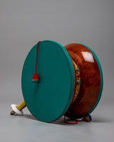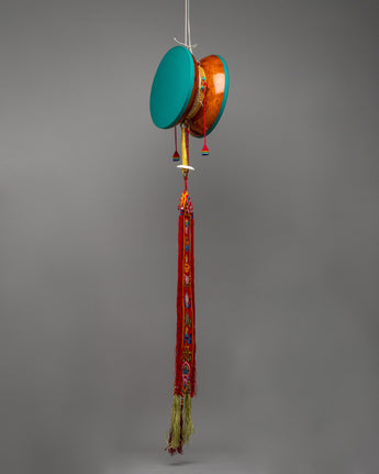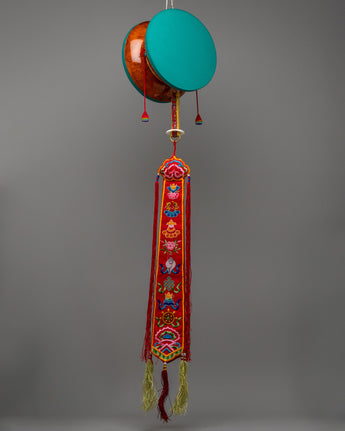 A Chod drum, integral to the Chod spiritual practice in Tibetan Buddhism, is a unique and symbolic instrument. Also known as a damaru, this small, double-sided hand drum has a narrow waist connecting two drumheads. The drum's shape is often likened to the hourglass, embodying the union of wisdom and compassion. Used by Chod practitioners during ritualistic ceremonies, the drum's rhythmic beating is believed to connect with the sacred energies, facilitating meditation and the realization of emptiness. The Chod drum, with its ritualistic role, underscores the synthesis of sound, spirituality, and meditation in Tibetan Buddhist traditions.