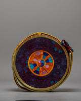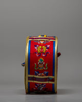 The Damaru's rhythmic rhythms are used in Tibetan rituals to call forth celestial favors and awaken spiritual powers. The cover that goes with the instrument protects it and also acts as a symbol of respect and containment of its strong spiritual force. This Ritual Damaru is a highly esteemed instrument in tantric rituals that transcends its material form to serve as a conduit for enlightenment and spiritual transformation, assisting practitioners in their journey towards transcendence and inner realization.