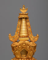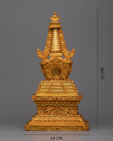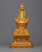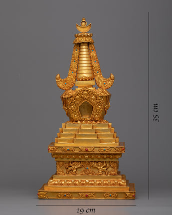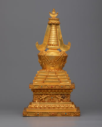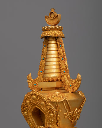 The Tibetan Shrine Stupa is meticulously handcrafted on a Copper body, displaying the craftsmen's artistry and devotion. The stupa is a sacred structure that represents the Buddha's enlightened mind. It is handcrafted with care and precision, reflecting the rich Tibetan tradition and culture. Furthermore, the stupa is panisun-plated, a traditional Tibetan decorative technique that involves applying a layer of gold. This plating not only improves the stupa's aesthetic appeal but also adds a sense of spirituality and reverence to the sacred space.