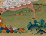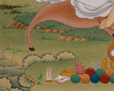 The thangka honors the great Tibetan Siddha Milarepa, depicted in deep meditation, and is intricately drawn in the traditional Karma Gadri style. Utilizing natural colors from Lhasa stones and highlighted with genuine 24K gold, this hand-painted masterpiece brings elegance and a religious touch that enhances the scene's spiritual weight.