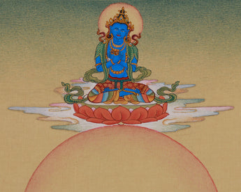 Above Milarepa, Vajradhara, the primordial Buddha, is portrayed as the ultimate source of all tantric teachings in Tibetan Buddhism. Vajradhara's presence in the thangka signifies the divine origin of the teachings that Milarepa mastered and subsequently passed down to his disciples. The flowing outlines and vibrant colors that connect Vajradhara and Milarepa illustrate the transmission of profound dharma from the celestial to the earthly realm.