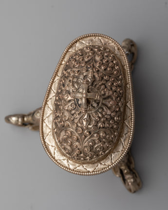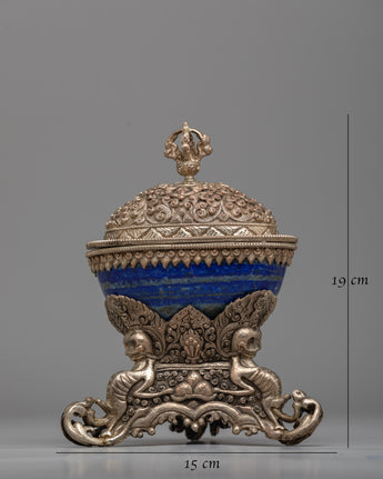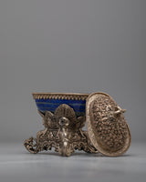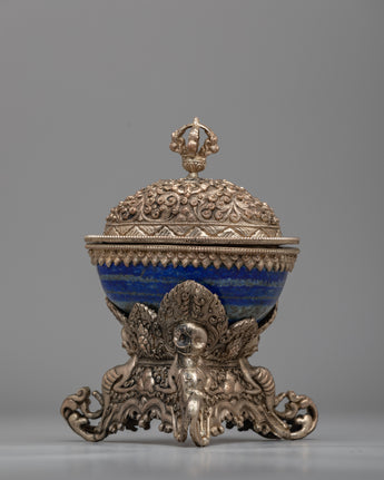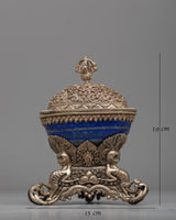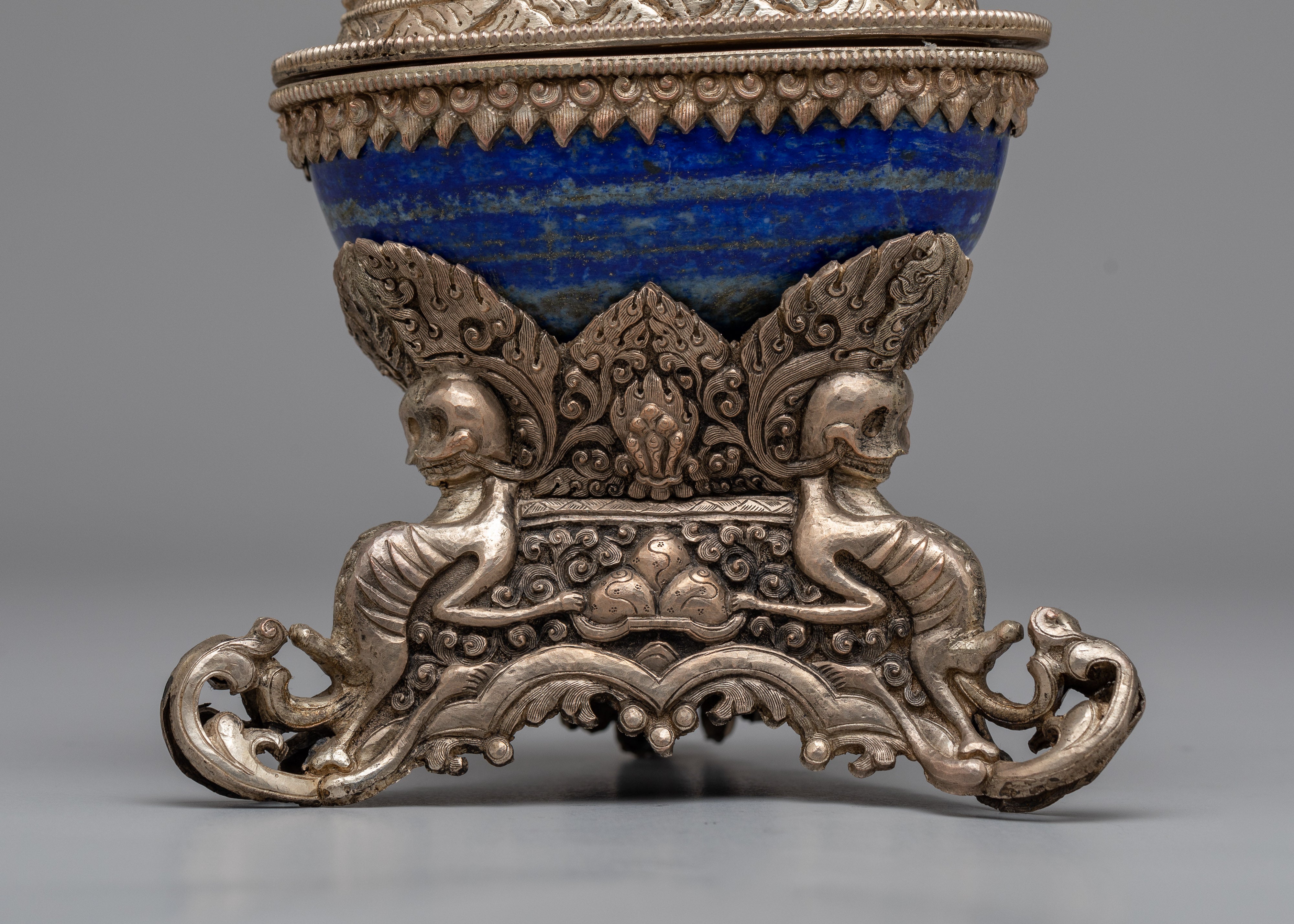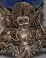 Introducing the Tibetan Skull Cup Kapala, a stunning example of craftsmanship and spiritual symbolism. This amazing piece, handcrafted with great care on a copper body plated in silver, captures the essence of traditional Tibetan traditions. It emanates luxury and intrigue as it is adorned with lapis lazuli stones weighing 480 grams in total.
