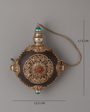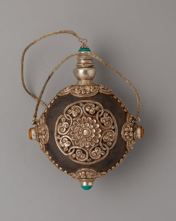 A beneficial and exclusive representation of Himalayan creativity is this Tibetan Snuff Pot with Turquoise Inlay. This pot, which weighs 0.28 kg and has measurements of 17.5 cm by 13.5 cm, is composed of fine white metal, electro-gold plated for a stunning appearance, and decorated with Original turquoise stones. In Tibetan tradition, snuff containers have long been used to store and preserve powdered incense or other sacred materials.