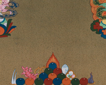 It also features a ritual offering display, symbolizing the practitioner's devotion to these qualities. This artwork is a spiritual tool and a collector's treasure, ideal for meditation spaces, teaching halls, or sacred altars, promoting deep reflection and the path of awakening through wisdom.