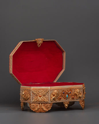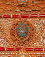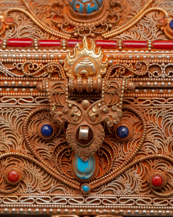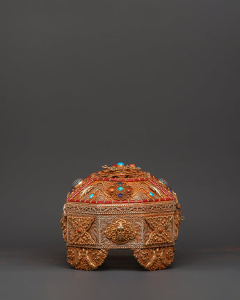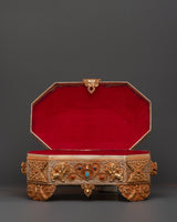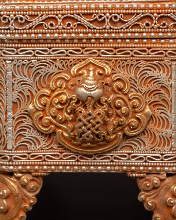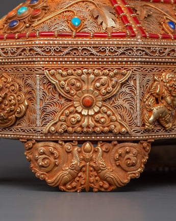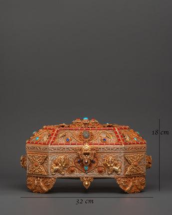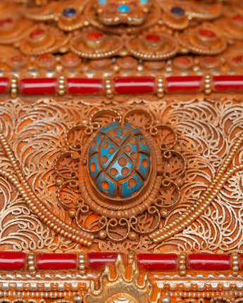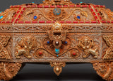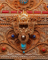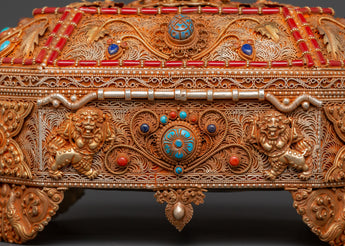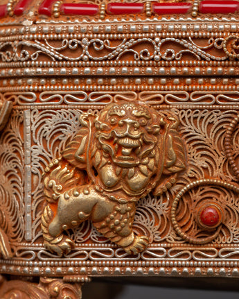 The stunning Tibetan Treasure Box with Coral represents sacred beauty and spiritual preservation. This elaborate chest, made of copper and gold-plated, is embellished with Original coral, turquoise, and lapis lazuli stones, each incorporated in stunning traditional Himalayan filigree designs. This box, supported by finely carved lion feet and guarded by protective deity faces, is suitable for keeping valuable relics, ritual materials, or personal spiritual keepsakes.