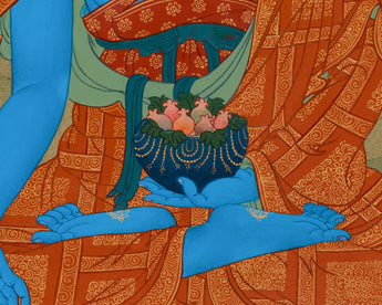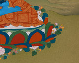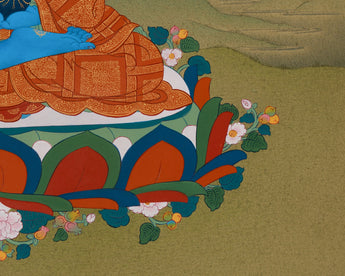 This Traditional Bhaisajyaguru Thangka is a sacred image of the Medicine Buddha, revered in Buddhism for his divine healing abilities. His rich lapis lazuli blue body symbolizes unending compassion and the ability to alleviate suffering on all levels: physical, mental, and spiritual. He radiates peace and security while seated on a lotus base in a meditative posture. This thangka features intricate designs, vibrant acrylic colors, and genuine 24K gold accents. Created in the traditional Karma Gadri style, it captures the rich spiritual heritage of Tibetan Buddhism, ensuring that each stroke is clear and precise.