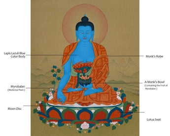 While his right hand, in the Varada Mudra, holds a stem of the healing plant, bestowing blessings of health and well-being, his left-hand cradles a monk's bowl filled with myrobalan fruit, which is known for its powerful medicinal properties. His radiant, bright halo symbolizes wisdom that guides followers toward serenity and enlightenment. Every brushstroke reflects commitment, making this thangka an excellent meditation aid for invoking healing energy, inner calm, and protection. Whether used as spiritual decor, for personal meditation, or as a meaningful Buddhist gift, this thangka serves as a profound reminder of compassion and global well-being.