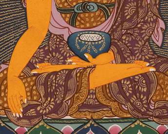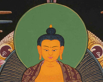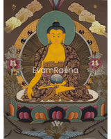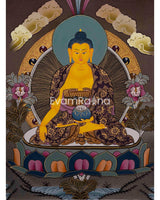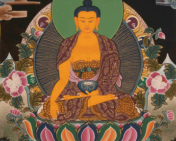 This Traditional thangka is a portrayed of Shakyamuni Buddha, a historical Buddha depicted in traditional Buddhist art in a seated meditative posture with his right hand touching the earth and his left hand resting on his lap. Shakyamuni Buddha is central to Buddhist artwork, symbolizing his attainment of enlightenment and his role as the teacher of the Dharma (path to liberation). The hand-painted painting features intricate details and vibrant colors, reflecting the artist's skill and spiritual devotion. The Buddha is adorned with auspicious signs, such as the ushnisha and the urna, which signify his enlightened qualities.