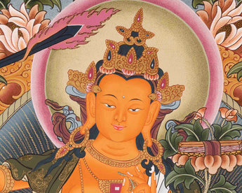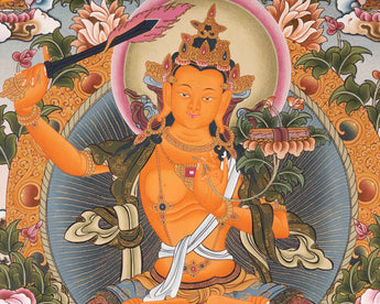 Manjushri is Graceful, Magnificent, and Melodic and embodies the Buddhas' unfathomable wisdom. He holds a burning sword of wisdom in his right hand, and in his left is a lotus flower stem on which a book of the Perfection of Wisdom sutras sits. His two-edged blade rips through layers of ignorance, sharply distinguishing between the independent and accurate interconnected ways things look. Manjushri depopulated Nepal's Kathmandu Valley, making it livable for people and disseminating the Buddha's teachings.