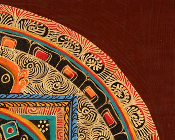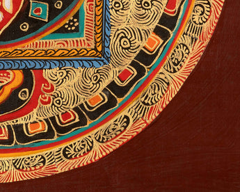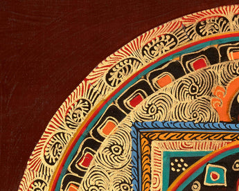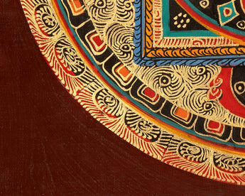 The Traditional Mantra Mandala Thangka is a beautiful piece of Tibetan art, created to be both a visual delight and a spiritual guide. This Thangka is hand-painted on cotton canvas, offering a smooth, durable surface for delicate designs. The brilliant hues are brought to life with acrylic colors, ensuring both vividness and longevity. Genuine 24K gold is used to accentuate the sacred details and add a beautiful radiance to the artwork. This thangka, by a Nepali artist, exemplifies traditional style and skilled work, making it both an artwork and a spiritual piece.