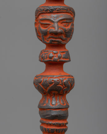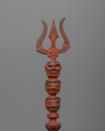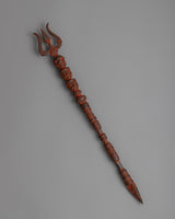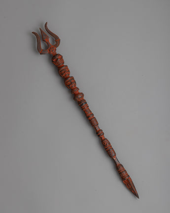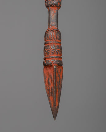 The Trishul, a three-pronged spear, rises magnificently from the tip of this sacred dagger, signifying the destruction of ignorance, attachment, and aversion, the three primary causes of suffering according to Buddhist doctrine. Below the Trishul are three beautifully carved skull heads, representing life's impermanence and ultimate escape from the cycle of rebirth. The dagger's base has a triangular-shaped blade, which represents steadiness and the sharp wisdom that cuts through delusion. This ritual dagger, adorned with delicate Buddhist art and designs, is more than just a decorative object; it is also an influential spiritual symbol, acting as a reminder of transformation, clarity, and heavenly protection for individuals on their spiritual journey.