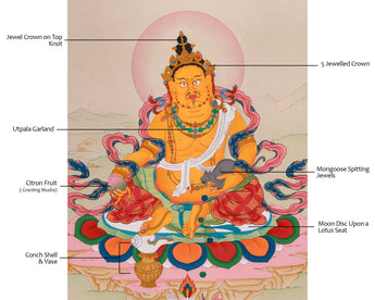 Jambhala is depicted with a five-jewelled crown and a jewel crown on his top knot, symbolizing his divine authority. He wears a blue lotus garland and holds a mongoose spitting jewels, representing his ability to bestow wealth. The citron fruit in his other hand signifies his power to grant wishes. Seated on a lotus pedestal with a moon disc beneath him, and with one leg extended to a conch shell and vase, Jambhala embodies both his regal status and his role as a generous provider of prosperity.