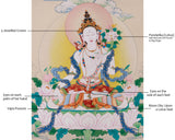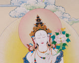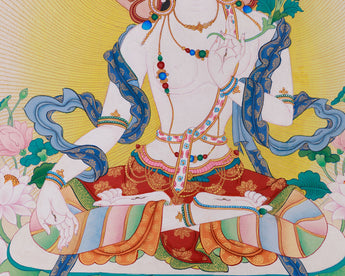 Experience the tranquil beauty of the White Tara Compassion Deity through this expertly hand-painted thangka, designed to evoke healing, extend longevity, and offer spiritual safeguarding. It is created on high-quality cotton canvas with vibrant natural stone colors and 24K gold highlights, ensuring its durability and vibrancy. The traditional Karma Gadri style, known for its balanced composition and elegant simplicity, allows White Tara's compassionate presence to shine with clarity and grace.