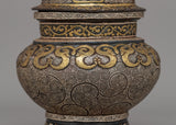 This traditionally crafted rice pot is an exquisite example of artisanal metalwork, measuring 25 cm in height and 13 cm in width. Made from iron, the pot features intricate brass and silver inlaid floral carvings, showcasing the detailed craftsmanship typical of traditional Tibetan art. The swirling patterns covering the pot's body add depth and beauty to its design. The brass and silver inlays enhance these patterns, making the pot visually captivating and rich in texture.