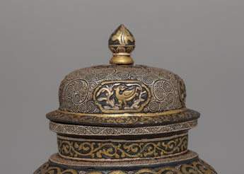 The base of the rice pot is beautifully carved, adding further elegance to the overall design. The top of the pot, which includes a lid, features bird and animal-like carvings, adding elements of nature and spirituality to the piece. These carvings reflect traditional Tibetan and Himalayan art motifs, symbolizing a connection to nature and the divine. The lid’s decorative knob, shaped like a conventional stupa finial, adds a final touch of cultural significance and balance to the pot's design.