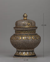 A unique feature of this rice pot is its balance between artistry. While it is a practical container, its ornate carvings and thoughtful details elevate it into a work of art. The combination of brass and silver inlays creates a striking contrast against the dark iron body, making this pot stand out. Its detailed craftsmanship and symbolism make it a functional item and a meaningful object that reflects the artistic traditions and spiritual symbolism of Tibetan culture.