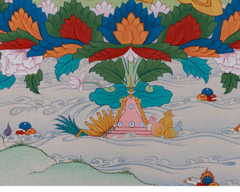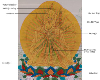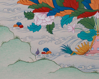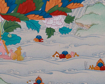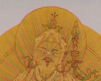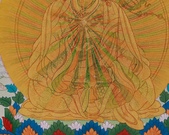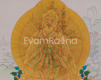 Experience a rare Guru Rinpoche Painting, carefully hand-painted in our studio using genuine 24K gold and natural stone colors. Created in the traditional Karma Gadri style, this thangka vividly depicts Guru Rinpoche surrounded by a radiant rainbow halo symbolizing his enlightened energy and spiritual power.
