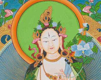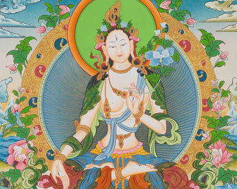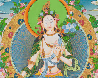 A White Tara Thangka is a serene and spiritually uplifting Tibetan Buddhist artwork that adds cultural richness and is a focal point for meditation. Embracing its vibrant colors and intricate detail, it inspires peace and well-being in any space, making it an ideal addition to any home or office decor.