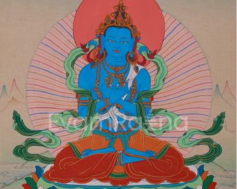 Radiating the ultimate embodiment of primordial enlightenment, this Vajradhara Buddha Art thangka is a powerful representation of the supreme tantric Buddha, Vajradhara, the source of all Buddhist teachings. It symbolizes the union of wisdom and compassion, representing the Buddha's original nature. The thangka is beautifully hand-painted using vibrant acrylic colors on soft cotton canvas. It’s enhanced with 24K gold detailing, showcasing the traditional Karma Gadri style that truly brings it to life.