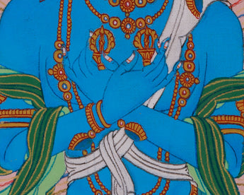 Vajradhara is rendered with a deep blue body, symbolizing infinite space and the vastness of the enlightened mind. He is seated in the vajra posture on a lotus seat, representing purity and spiritual awakening. His hands are crossed in the signature tantric mudra, holding a bell in the right hand and a vajra in the left, symbolizing the inseparable union of wisdom and method. The intricately detailed five-jeweled crown on his head marked his enlightened status. This thangka is a visually stunning and spiritually potent centerpiece, ideal for meditation rooms, altars, or sacred collections.