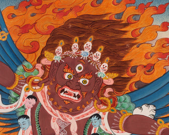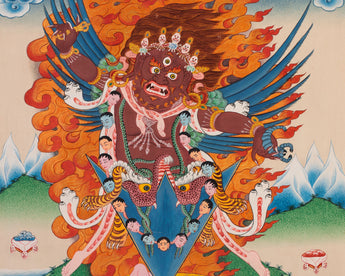 Vajrakilaya is depicted with three piercing eyes, symbolizing his all-seeing wisdom and awareness of the past, present, and future. His body takes the form of a phurba, a ritual dagger that signifies the ability to eliminate ignorance and duality. He wields a vajra, representing indestructible wisdom, and holds a scorpion, symbolizing his power to tame and transform negative forces. Wearing a garland of human heads, he embodies the transcendence of mortality and ego. With a blazing aura surrounding him, Vajrakilaya radiates powerful energy for protection and transformation.