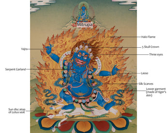 He is depicted with four arms with symbolic objects: a vajra, symbolizing the power to cut through ignorance, and a vajra lasso to bind negativity. The central hands perform the Humkara Mudra, a wrathful gesture of subduing demons and clearing obstacles from the path to enlightenment. Vajrapani Butadamara stands atop a subdued deity, symbolizing triumph over ego and destructive forces. He is seated on a sun disc and a blooming lotus, symbolizing his enlightened nature and ability to guide sentient beings.