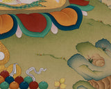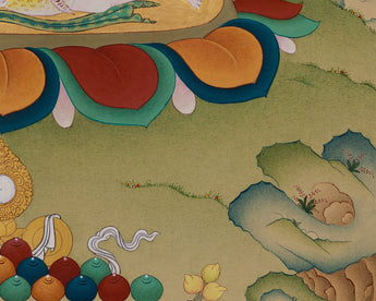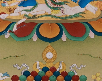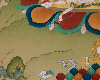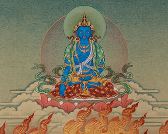 Above him, Mitrupa, a symbol of wisdom and non-dual awareness, is depicted in serene meditation. Mitrupa’s presence balances Vajrapani’s fierce energy, reminding practitioners that true power comes not from dominance but from profound inner realization. This thangka, suitable for meditation, altar decoration, or spiritual empowerment, offers protection and enlightenment, making it a significant addition to any sacred space.