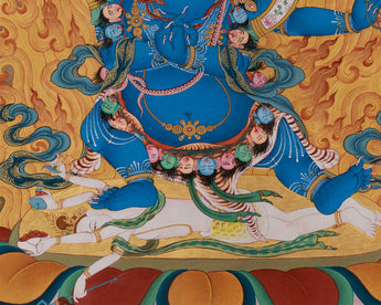 The Vajrapani Butadamara thangka, measuring 18 by 24 inches, is a powerful representation of divine strength and wisdom. It stands as a testament to Tibetan artistic mastery, following the Karma Gadri style, which is known for its refined elegance and spacious composition. Hand-painted with natural pigments sourced from Lhasa stones, the thangka features intricate 24K gold embellishments that illuminate the detailed patterns. It is meticulously created on fine cotton canvas, with each brushstroke infused with devotion.