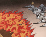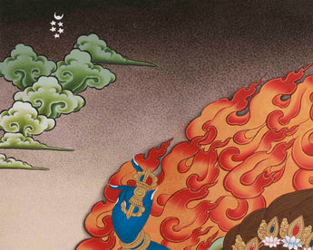 Vajrapani, a prominent figure in Mahayana and Vajrayana Buddhism, symbolizes power, courage, and spiritual strength. He is depicted as a wrathful Bodhisattva, guarding the Buddha's teachings and guiding practitioners towards enlightenment. His name, "Thunderbolt Holder" or "Diamond Holder," signifies the indestructible nature of enlightenment. Vajrapani's right hand holds a vajra, a symbol of skillful means and the transformative power of wisdom. He holds a lasso in his left hand, symbolizing his ability to subdue negative forces, including ignorance, attachment, and aversion. His wrathful appearance, bulging eyes, fangs, and flames, signify his ferocity in combating ignorance and delusion. However, behind his fierce exterior lies boundless compassion and wisdom. As a Bodhisattva of energy and transformation, Vajrapani inspires practitioners to cultivate inner strength, determination, and fearlessness in their spiritual journey. His presence in Thangka art serves as a reminder of the courage and resilience needed to navigate life's challenges and attain liberation.