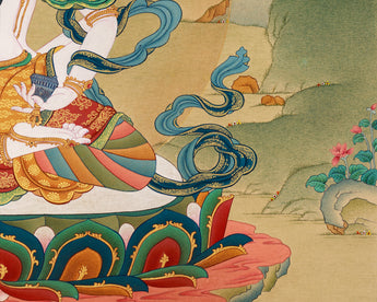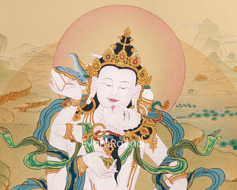 Immerse yourself in the transcendent beauty of our Vajrasattva Consort Thangka, a masterful piece of Tibetan art that captures the profound essence of sacred purification and enlightenment. This majestic Thangka intricately portrays Vajrasattva and his consort in a divine embrace, embodying the principles of purification and spiritual union.
