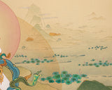 The artwork vividly depicts Vajrasattva in his iconic form—seated in a yab-yum (union) posture, symbolizing the unity of wisdom and compassion. Adorned with a diamond scepter (vajra) and a bell (ghanta), which represent the indestructible and wisdom aspects of the deity, this Thangka reflects the deep symbolism of Vajrasattva's role as the Purification Deity and Bodhisattva of Purification. His consort, equally adorned in sacred attributes, complements the representation, emphasizing the harmonious balance of divine energies.