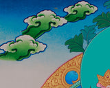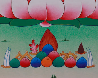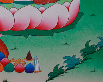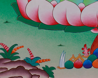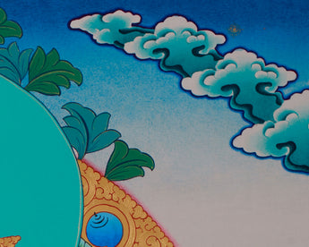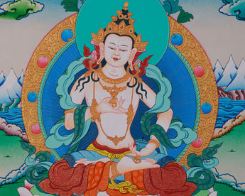Surrounded by golden embellishments that highlight his celestial presence, Vajrasattva is depicted seated on a vibrant lotus, which represents purity and spiritual growth. The tranquil background, featuring mountains and clouds, enhances his role as a purifier of the mind and spirit. Beneath the lotus, symbolic offerings like jewels and ritual tools are presented, underscoring the purification process. This thangka serves as a powerful reminder of Vajrasattva's transformational ability and is an excellent addition to meditation spaces.
