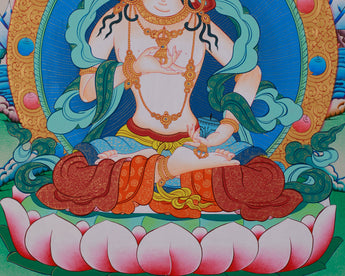 With great precision and vivid hues, Thangka brilliantly illustrates Vajrasattva (Dorje Sempa), the potent Bodhisattva of purification and spiritual transformation. The thangka, hand-painted on cotton canvas using acrylics and adorned with genuine 24K gold, portrays him in a tranquil, reflective pose. His left-hand holds a bell, symbolizing wisdom that rises above ignorance, while his right-hand clutches a vajra, signifying the removal of barriers.
