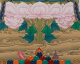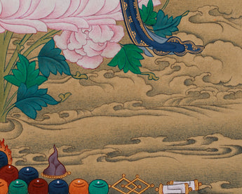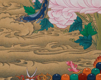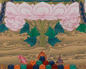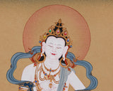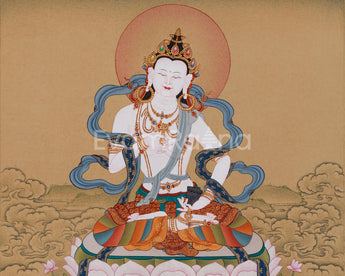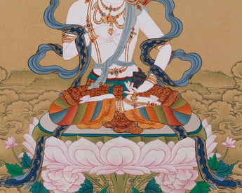 Vajrasattva is considered the embodiment of purity, called upon by practitioners to purify negative karma, remove obstacles, and achieve spiritual clarity. He is traditionally depicted holding a vajra (diamond scepter) and a bell, symbolizing the indestructible nature of wisdom and the union of wisdom and compassion. His serene yet powerful posture represents inner peace and the ability to overcome distractions. This thangka is more than just an artistic creation; it's a sacred object of devotion and a powerful tool for spiritual transformation. It brings clarity, purification, and divine protection into one's life, making it an invaluable addition to any sacred collection.