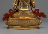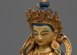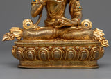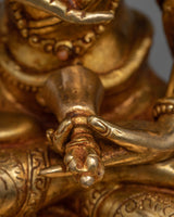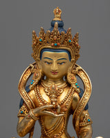 This Vajrasattva statue is a masterpiece of traditional Himalayan artistry, meticulously hand-carved in our studio. The statue depicts the Bodhisattva in a serene and peaceful state, seated on a lotus seat in the lotus posture. The statue is made of copper and then gilded with genuine 24K gold, giving it a brilliant luster and highlighting the intricate design patterns. The Buddha's right-hand holds a vajra, symbolizing the indestructible and unchanging nature of reality, while his left-hand holds a bell, representing emptiness and the sound of wisdom. Our skilled artists took several months to carve the statue's intricate patterns and motifs, which are beautifully highlighted with acrylic colors.
