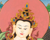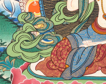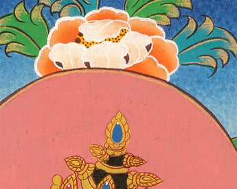 This earthly-toned Vajrasattva Thangka is a breathtaking art. As you can see Vajrasattva seated on the lotus throne at the center. Our thangka is a hand-painted art with magnificent detailing.