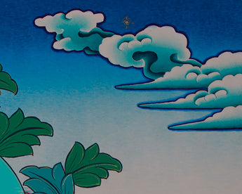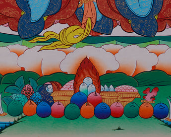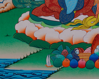 His consort, Vajragarvi (Dorje Nyema), represents the wisdom side and is shown in a divine union with him, demonstrating the inseparability of wisdom and method in achieving enlightenment. The clouds, rivers, and mountains in the background emphasize the spiritual and heavenly aspect of Vajrasattva's force. The multiple offerings at the base reflect the purifying of negative karma, while the lotus base represents spiritual awakening. In Vajrayana Buddhism, this thangka is utilized as a means of meditation in visualization exercises to clear the mind and eliminate karmic distractions. This thangka, which is perfect for altars, meditation areas, or sacred rooms, generates heavenly energy and will enrich your life with wisdom, compassion, and clarity.