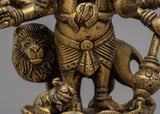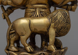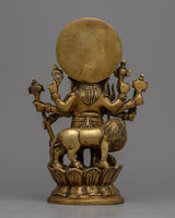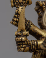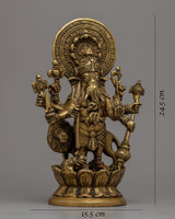 This Lord Vinayaka statue of brass is handcrafted with great attention to detail. The deity is depicted standing confidently on a lotus base with a halo behind him, exuding a sense of divinity and power. The statue has four hands, each holding a different symbolic object, and is adorned with intricate designs and patterns on the body. The brass body is polished to a shine, adding to the statue's overall aesthetic appeal. It is a beautiful representation of Lord Ganesha, the remover of obstacles and the lord of beginnings.