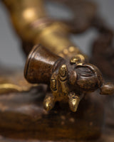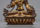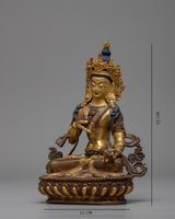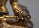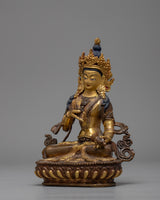 The Great Purifier, Vajrasattva(Dorje Sempa), is shown holding a bell in his left hand at his hip and a Vajra in his right hand at his chest in the statue. The bell represents wisdom, whereas the vajra represents compassion. He sits peacefully, legs crossed, atop a lotus seat on a moon disc. The lotus seat means how he remained in this impure cycle of samsara to benefit sentient beings while remaining unaffected by its flaws.Vajrasattva is an early Vajrayana Buddhist practice essential to Shingon Buddhism. He is a magnificent manifestation of Vajradhara.