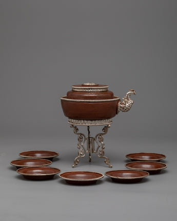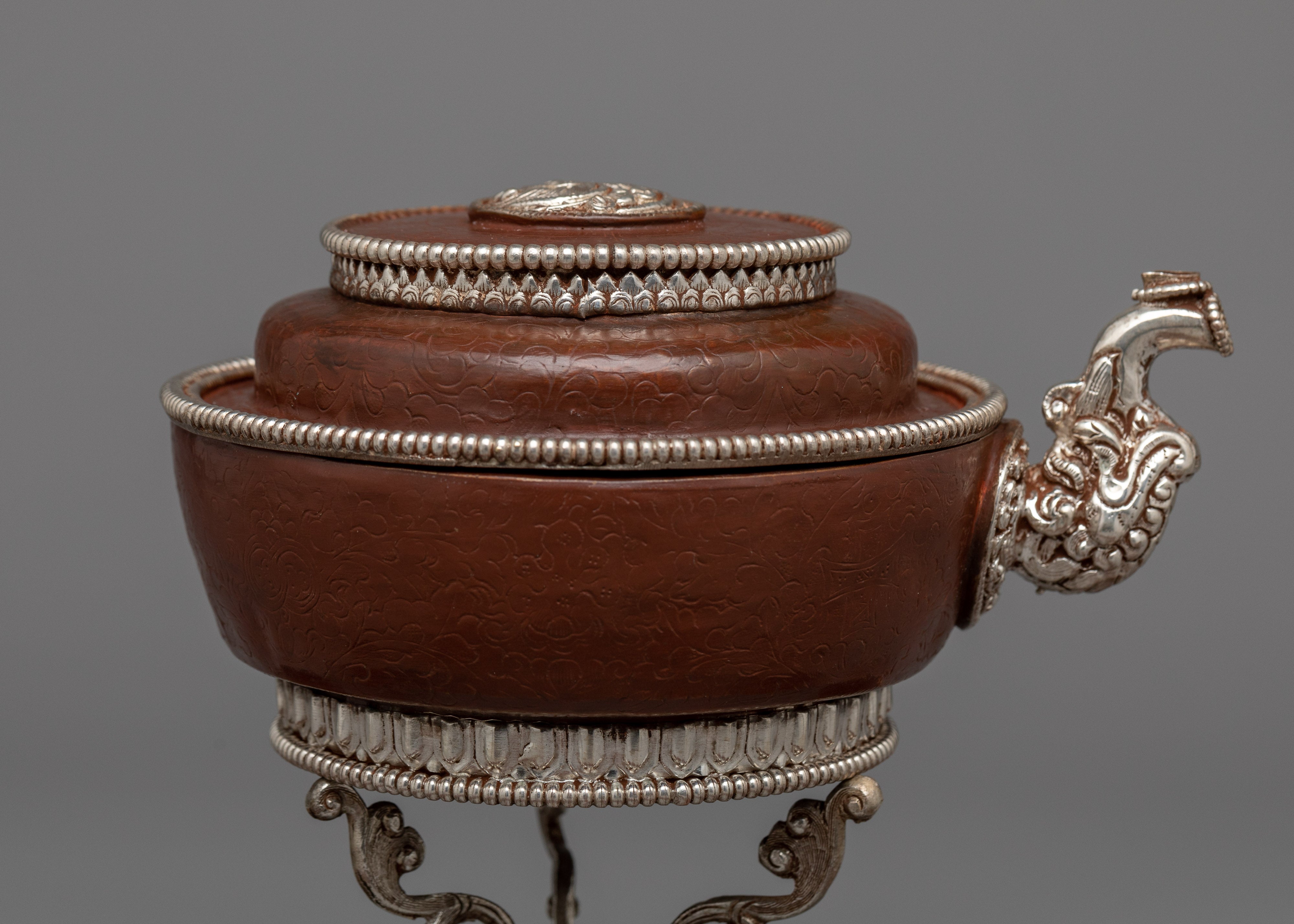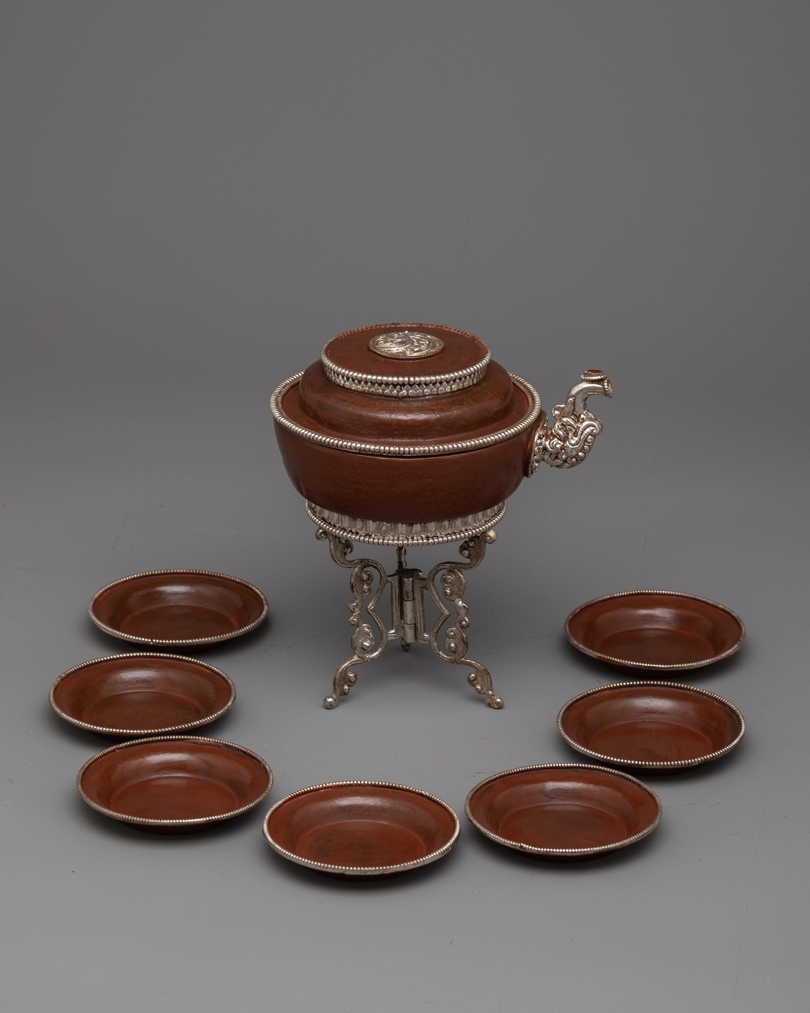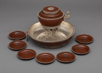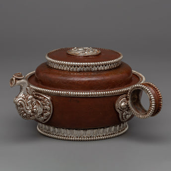 Our Jambhala Water Offering Set immerses you in the time-honored ritual of sacred offerings. This set is handcrafted with precision on oxidized copper and embellished with exquisite silver plating, capturing the aura of reverence and dedication. Each part is precisely crafted to enhance your spiritual practice and create a sacred environment in your room.
