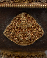 These Water Offering Bowls are a lovely symbol of Tibetan Buddhist devotion and ceremony. They are handcrafted with precision and care from copper and plated with gold and silver, providing a beautiful contrast. The bowls are embellished with auspicious symbols that have been carefully sculpted to increase purity and visual appeal. These bowls are used to offer water as a basic aspect of Buddhist practice, symbolizing cleanliness, cleaning, and the aim to cultivate virtuous traits. These Water Offering Bowls, with their exquisite craftsmanship and spiritual symbolism, are a meaningful addition to any altar or spiritual area, bringing a sense of tranquility, reverence, and connection to the spiritual path.