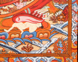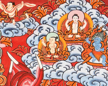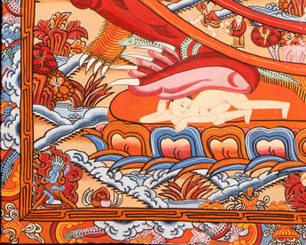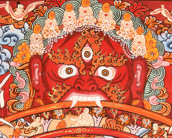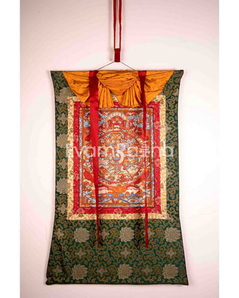 We introduce our Wheel of Life Thangka, with a luxurious Brocade Silk Frame. The intricate design of this orange-red colored Thangka, adorned with a vibrant green brocade brings the essence of the Wheel of Life to life.