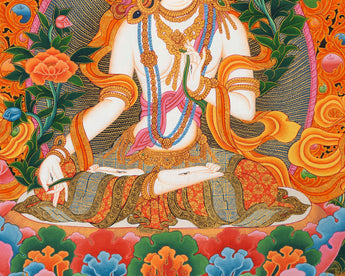 This stunning White Tara Artwork thangka depicts the revered Tibetan Buddhist goddess of compassion, healing, and longevity. This thangka is hand-painted on high-quality cotton canvas, creating a durable and authentic foundation that pays homage to traditional Tibetan artwork. The brilliant hues are brought to life with carefully applied acrylic colors selected for their vividness and enduring brilliance. Genuine 24K gold accents are delicately interwoven throughout the design, creating a radiant richness that highlights the divine nature of the deity and showcases the artist's remarkable expertise. This piece, created by a professional Nepali artisan in the traditional style, showcases exceptional skill and cultural authenticity.