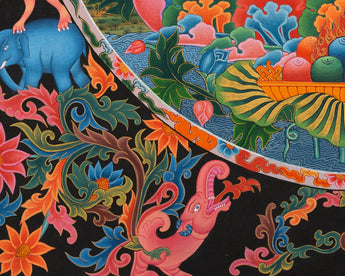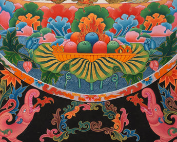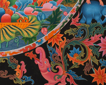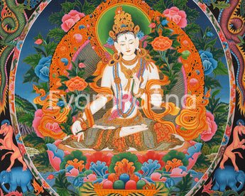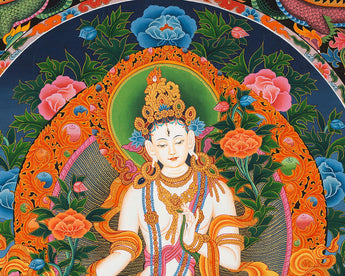 White Tara exudes divine calm as she sits gracefully on a vibrant lotus seat. Her seven all-seeing eyes symbolize her omnipresent compassion for all beings, while her pure white form signifies serene wisdom and enduring love. Dressed in sacred jewelry and flowing silk robes, she performs the varada mudra with her right hand, offering blessings and charity, while her left hand holds a blooming utpala flower, symbolizing spiritual enlightenment. White Tara is surrounded by a lush and symbolic pattern adorned with colorful floral motifs, blooming lotuses, and mythological creatures like elephants and dragons that enhance the composition's religious ambiance. This thangka is a powerful spiritual object that can invoke the protection, healing, and longevity benefits of White Tara.