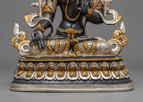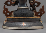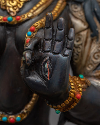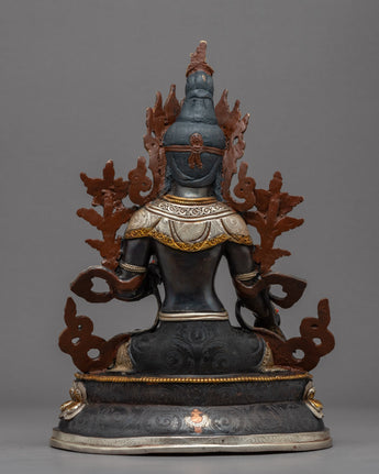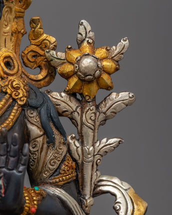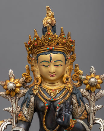 The magnificent White Tara Female Buddha Statue was hand-carved in Nepal using customary Himalayan methods. We have sculpted Buddhist sacred figures for many years. This White Tara figurine is crafted from oxidized copper. We have gilded the face of the deity using genuine 24K gold. The lotus seat, robe, and utpala are partly gilded with gold; The other half is silver plated. While the face, crown, and body ornaments are fully gilded with gold. We have used acrylic paintings on the statue and the body to highlight the facial attributes. The crown and the body ornaments are adorned with precious gemstones. This White Tara statue will be a perfect gift from Nepal to a devotee like you that will aid you in your practices and regular activities such as meditation and yoga.